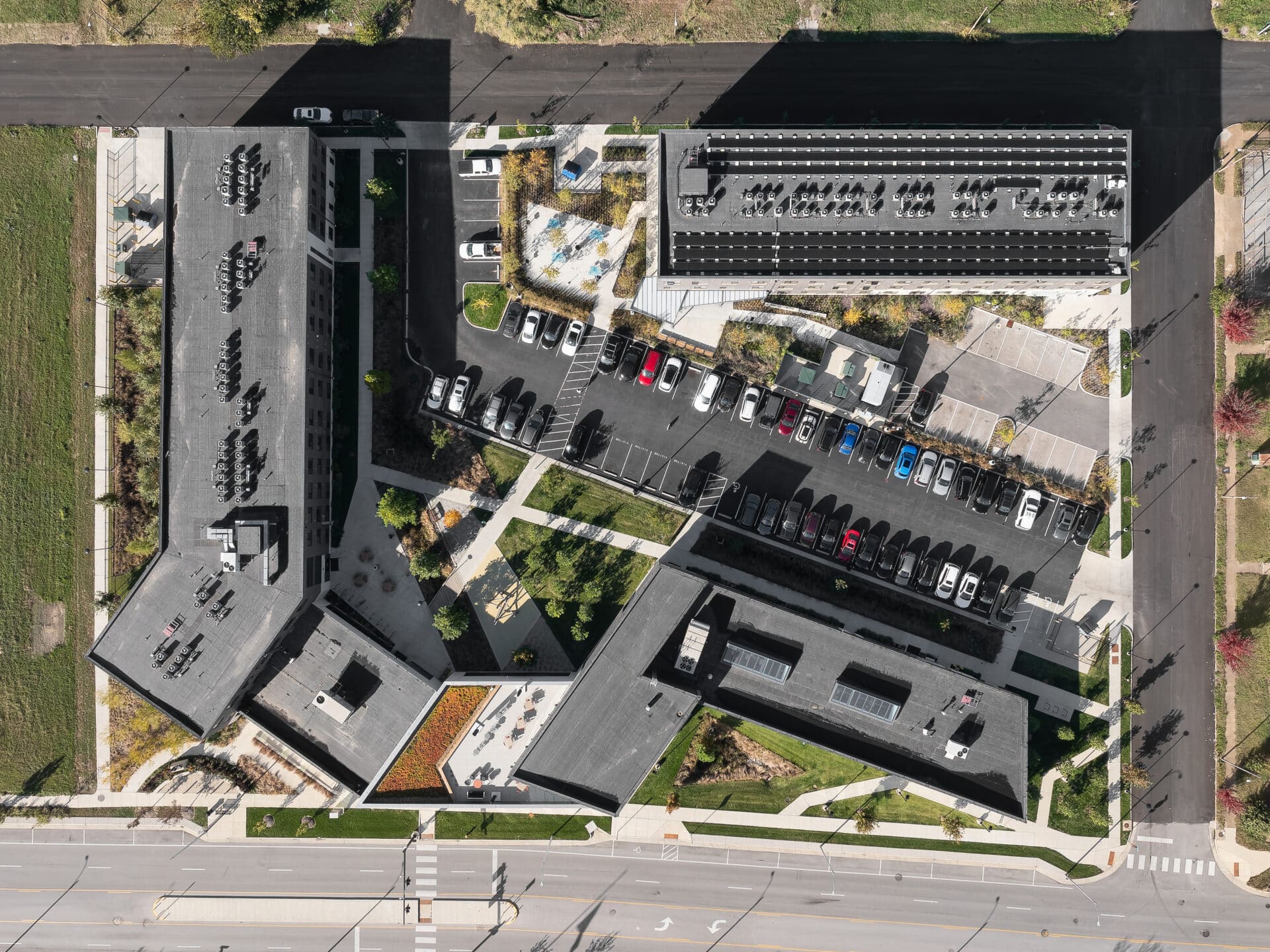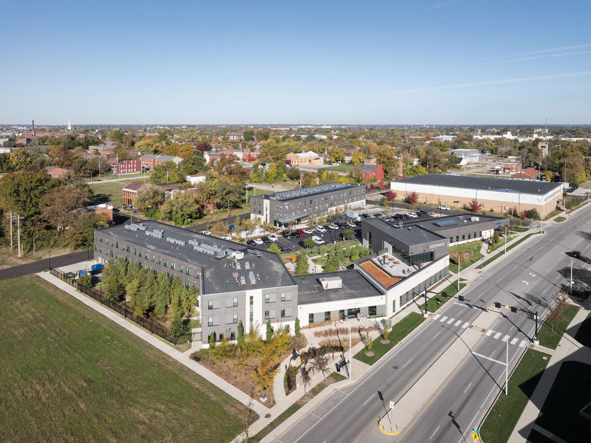 Trivers partnered with DOORWAYS on the planning and development of a three acre site selected just north of Downtown. The new campus includes 14,000 square feet of integrated program and administrative spaces, as well as 50 units of new transitional housing. With a focus on amenities that help clients transition from homelessness into permanent supportive housing, programming includes creative living arrangements as well as thoughtfully placed community spaces.